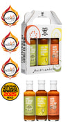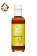 Kiwi und Ananas bilden die Fruchtkomponente aller drei Saucen. Während „nur ein bissi schaf“ eine milde Dosis von 9 % Habanero-Chilis beinhaltet, heizt „nix für’n kindergeburtstag“ mit 19 % Habanero- und geräucherten Chilis schon deutlich mehr ein. „geh leck mi am arsch“ hat es schließlich und endlich wirklich in sich: Ganze 30 % Carolina-Reaper-Chilis fahren ein ordentliches Programm und stellen sogar unsere TOM’S HOT SAUCE - Afterglow d eutlich in den Schatten.